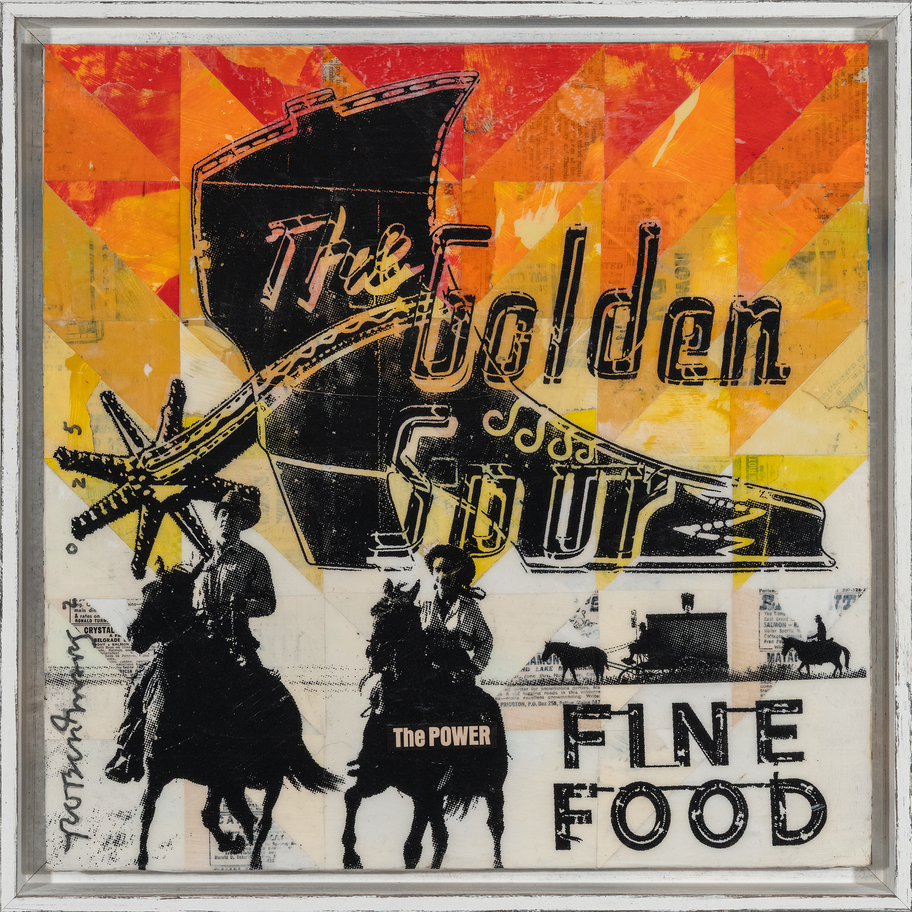 Mixed medium and collage on wood panel with UV Varnish.